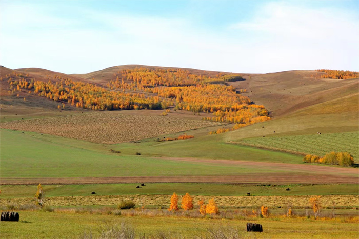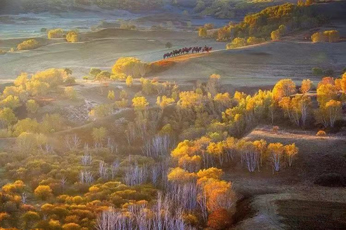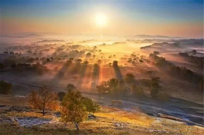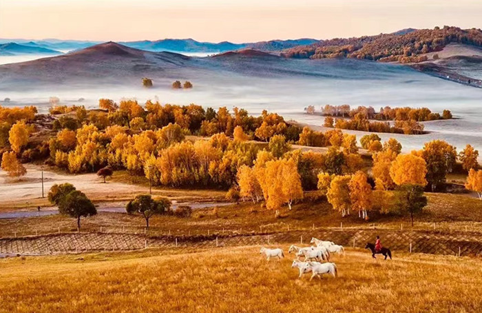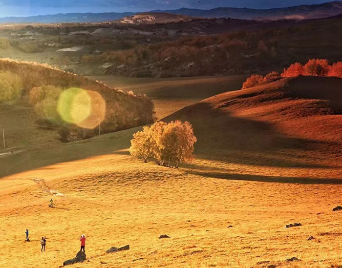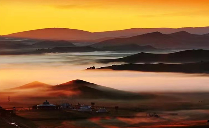 早起带领大家前往观看草原日出(需要早起,个人自愿),幸运的话我们能看见草原平流雾,登上山头雾气在山下四处流动,当太阳出来的一刻整个场景如仙境一般。拍摄结束后返回酒店用早餐,