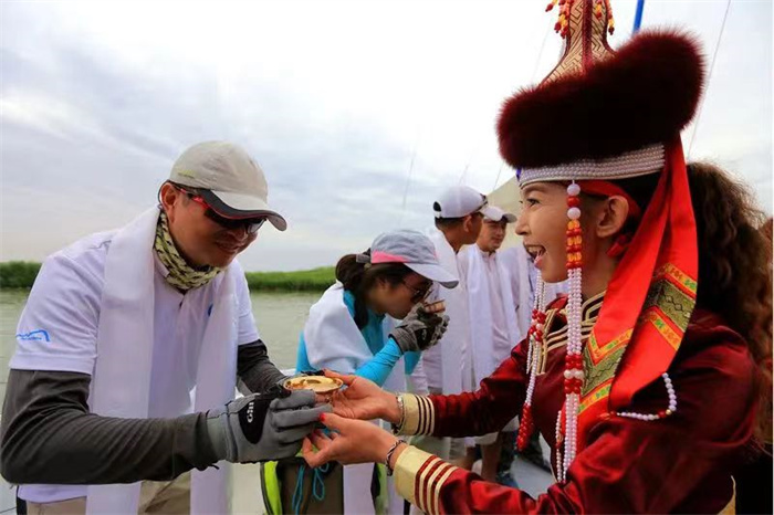 我们准备了充满蒙族风情的迎接仪式—下马酒、献哈达,我们要双手接过酒碗,用右手无名指蘸少许酒水,上敬天,下敬地,再轻点自己脑门,一口干了这杯酒,这是蒙古族接待贵宾的礼节。