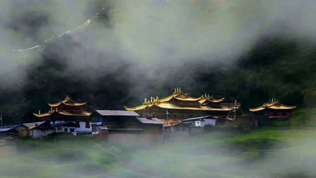 山雾缭绕之间,拉桑寺的的金顶熠熠生辉