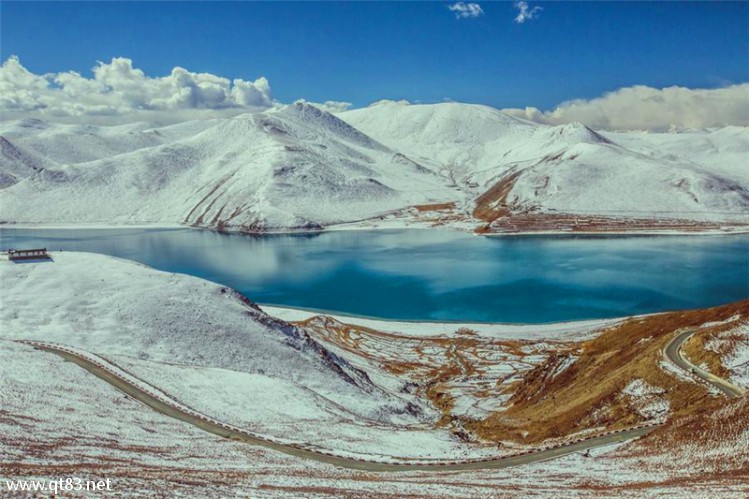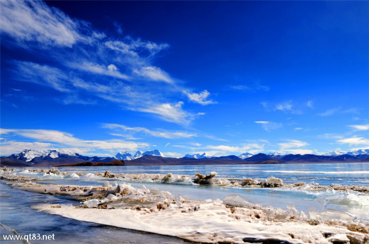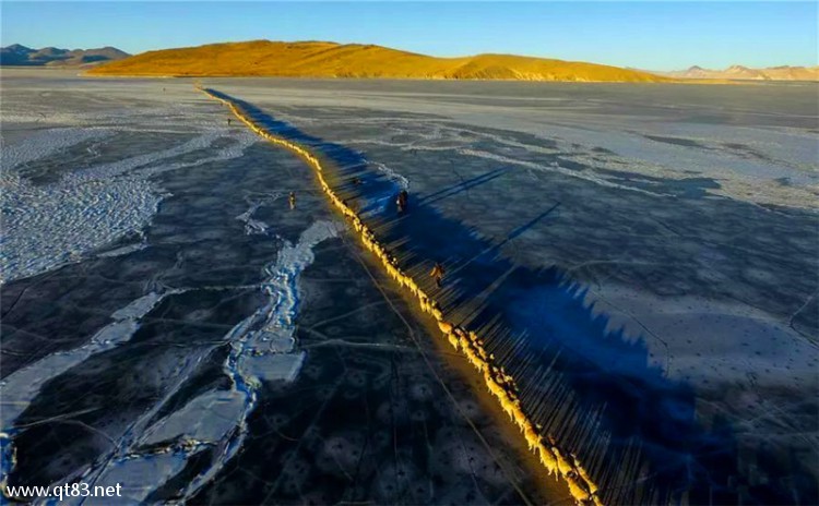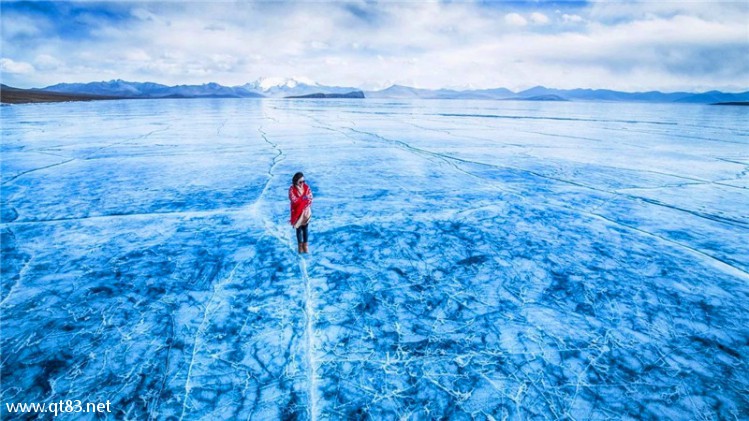 冬日的普莫雍错已变成了巨大的蓝色冰块,湖边堆起了巨大的冰浪,凸出的半岛上有一个海拔最高的藏族村落——推.村,推村有一座500多年历史的小寺庙,坐落在湖畔的悬崖之上,除了在推村欣赏,大家也可以在冰湖上进群凹造型拍照片!