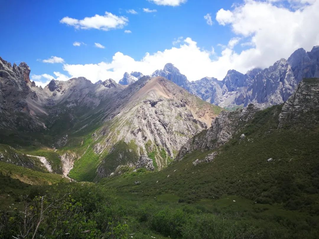 容闹沟—桑谷石门—涅甘达娃神峰—扎尕那石林—曹日卡—高山湖—久保沟(扎营) 入住:帐篷 徒步7小时,18公里左右,累计上升1800-1900米。沿传统的卡车沟—扎尕那线路向北徒步两小时左右,海拔上升700米到达扎尕那石林,继续转向东行五小时,上上下下翻越4个大小垭口,到达当晚宿营地,这也是从过石林后当日海拔最低的一片草地,海拔3600米左右。当日路比较明显,没发现岔路,过石林上到第一个垭口便看见雪山。