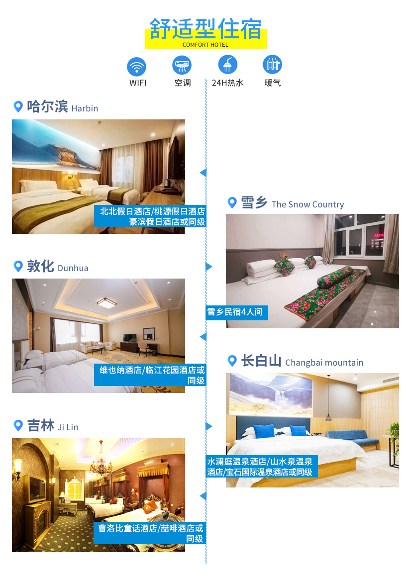 为了充分体验东北味儿,我们安排大家入住到当地的家庭客栈,挤火炕多人间,一开始南方的孩子们可能会睡不惯火炕(后背实在太热),但这种在北方流传数百年的生活习惯,除了保证了基本的保暖,更可以驱除体寒,治疗风湿等独特功效。这两晚,非常抱歉,由于条件所限,洗澡不是太方便。除此之外,均为宾馆标间,每天的住宿条件请查看行程安排。